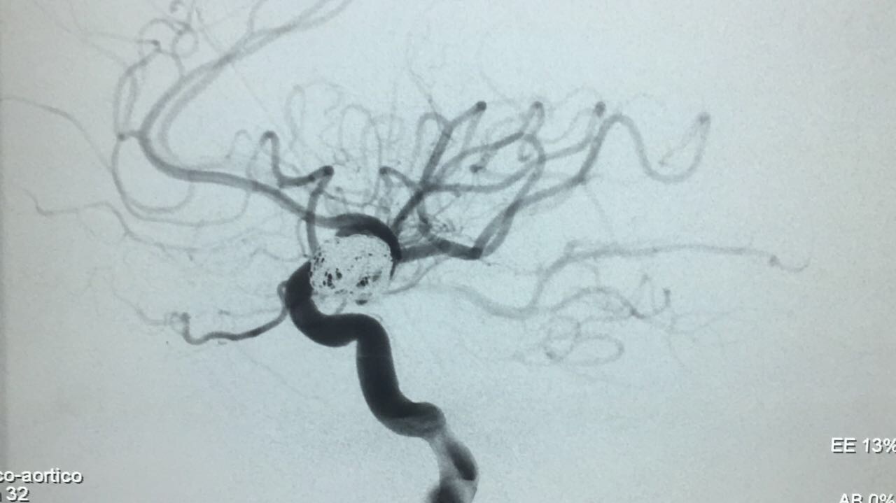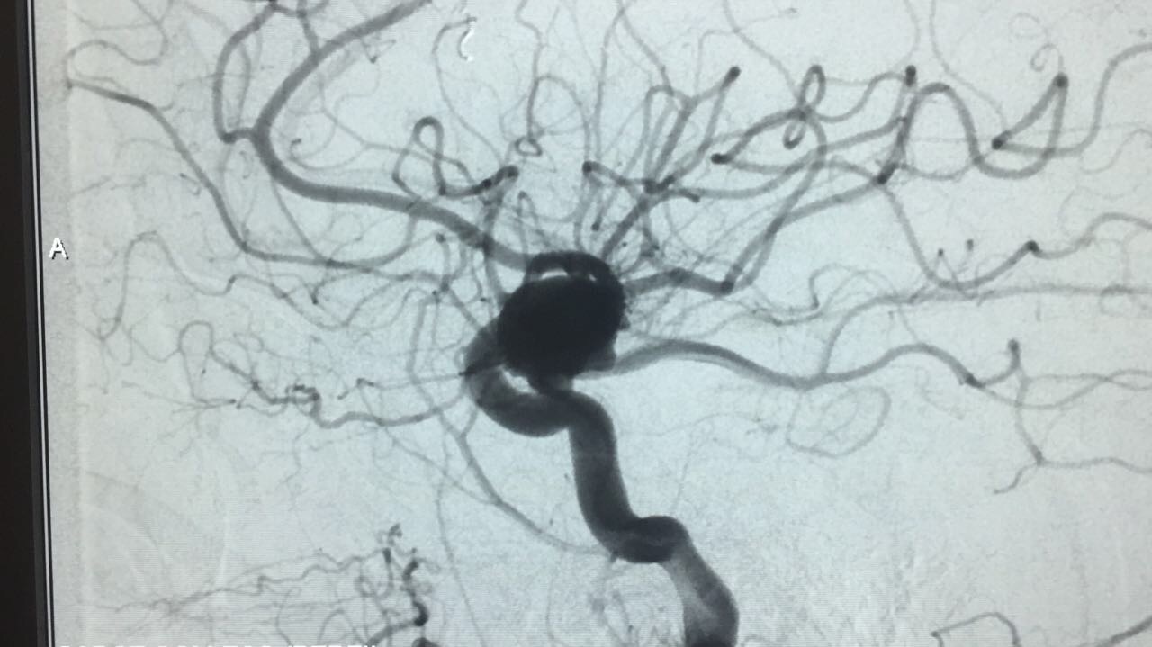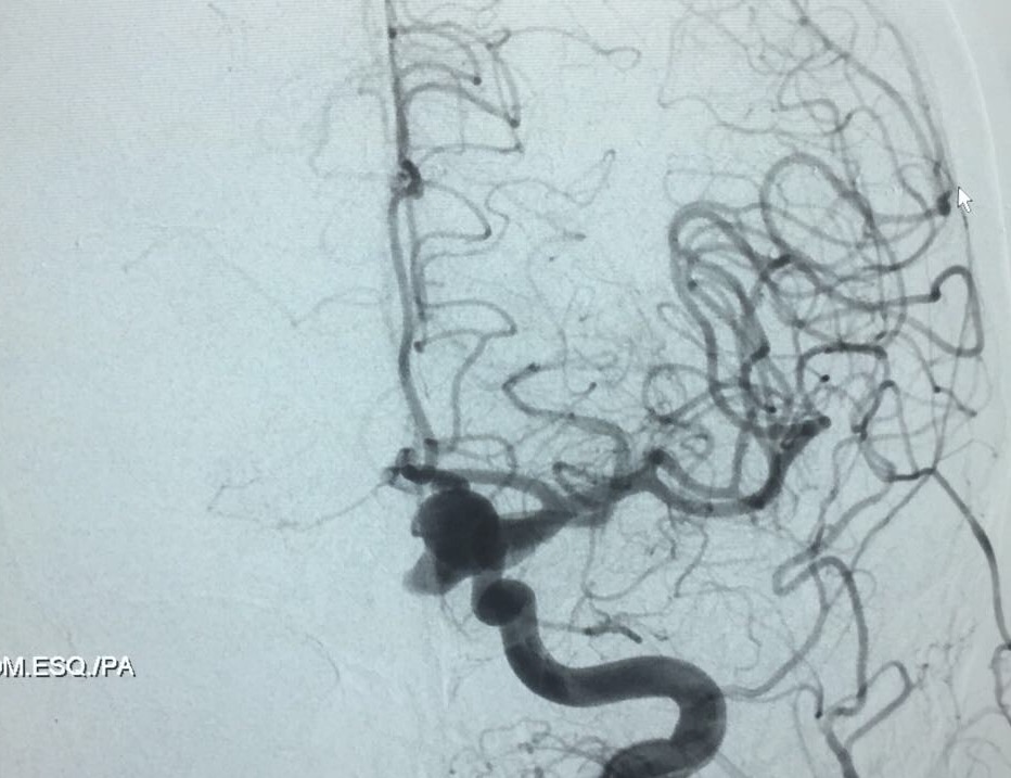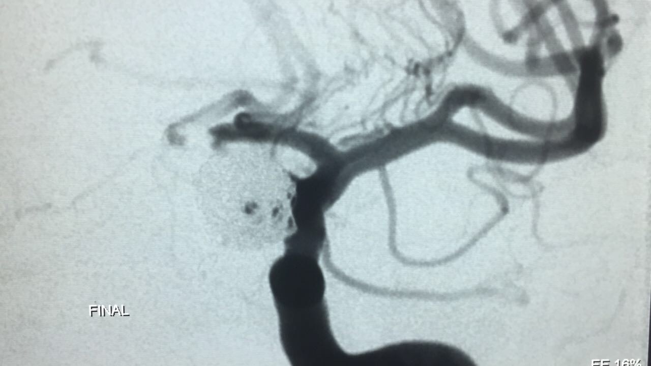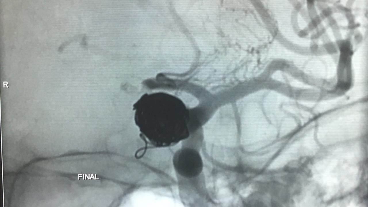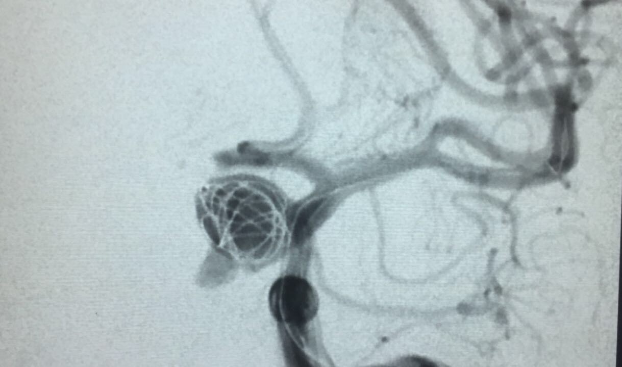 Paciente foi então encaminhada ao setor de hemodinâmica sendo realizado Angiografia cerebral Digital e evidenciado aneurisma de segmento oftálmico da artéria carótida interna esquerda. Realizado embolização do aneurisma com microespirais, sem intercorrências. A paciente permanece em bom estado geral e neurológico recuperando em pós operatório imediato.