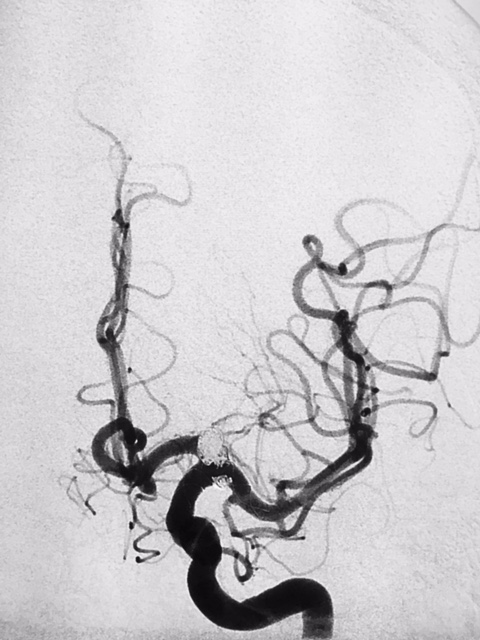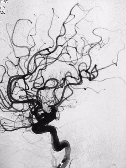 SNA. 76 anos. Durante investigação ambulatorial de cefaléia e tremor nas mãos foi realizado Angiotomografia de crânio evidenciando aneurisma incidental em topo da artéria carótida interna esquerda. Foi realizado Angiografia Cerebral diagnóstica para programação adequada do tipo de abordagem cirúrgica, neste exame confirmou a presença deste aneurisma sacular de contornos irregulares, com orientação superior e anterior, medindo 7,0 x 4,0mm com colo estimado de 4,5mm.
