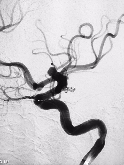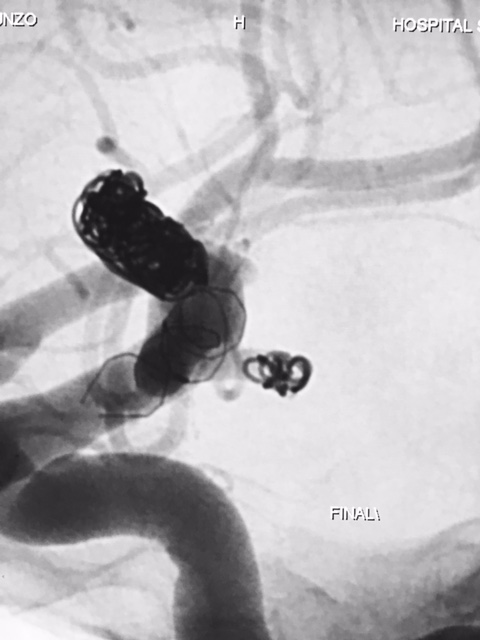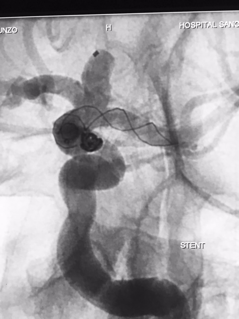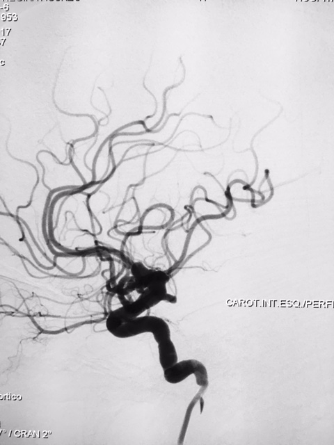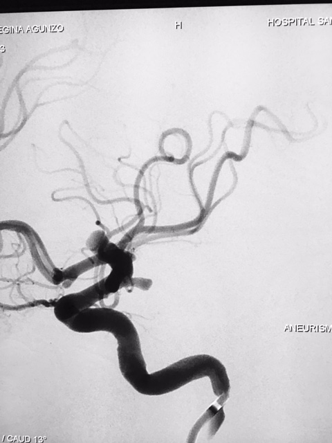 Diante da localização do aneurisma ( intradural ) foi indicado o procedimento terapêutico endovascular. Desde então se programou abordagem com uso de neurostent e molas em virtude da largura do colo do aneurisma. A discussão maior foi em relação ao posicionamento deste stent, direcionando para segmento A1 da artéria cerebral anterior ou segmento M1 da artéria cerebral média. Outros detalhes relevantes, esta paciente apresentava outro baby aneurisma em artéria do complexo comunicante anterior opacificando-se pela artéria carótida interna esquerda, hipoplasia do segmento A1 da artéria cerebral anterior á direita e outro aneurisma de segmento comunicante da artéria carótida interna esquerda.